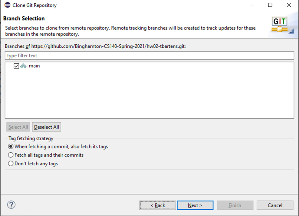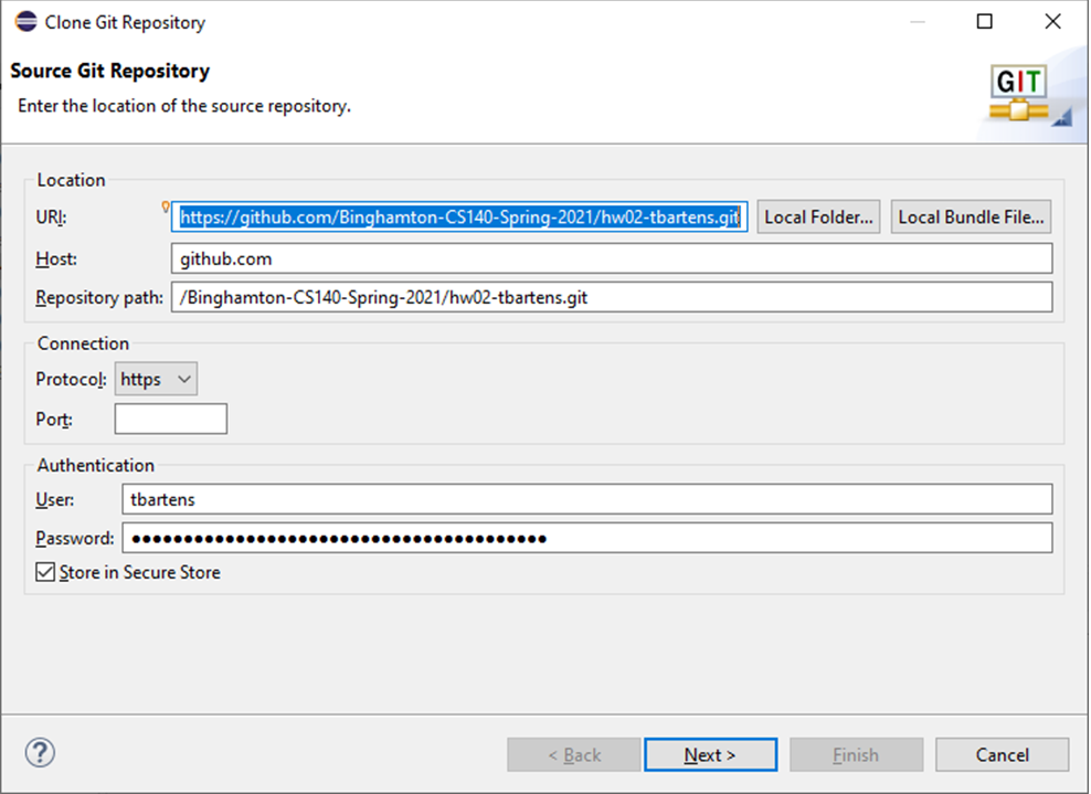 This is accomplished easiest by clicking on the Browse button to the right of the Directory: field, and navigating to your Eclipse Workspace directory (usually the directory above cs140), then into cs140 - the Eclipse project directory, then into "src". The display will then show ~\cs140\src\repos-gitUserID, where repos is the name of the repository, and gietUserId is your GitHub UserID. At this point, edit the destination directory by removing the "-gitUserId" suffix. Doing so will make the Eclipse package directory match the package specifications in the .java files in the repository - something which is required in Eclipse.