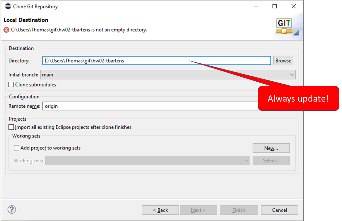 The rest of the fields default correctly, and the Finish button should now be enabled (the "not an empty directory" error message at the top of the screen will go away.) Click on the Finish button. At this point, the clone will actually take place and the files from the master repository will be copied onto your local hard disk.