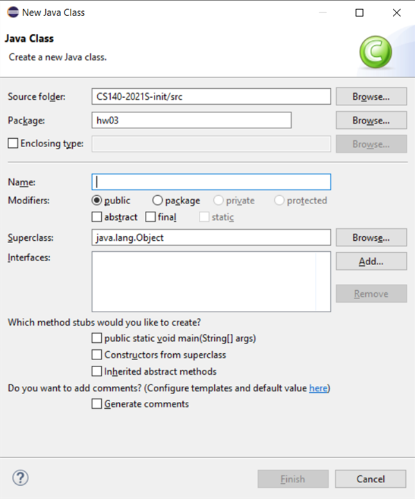 When you hit the Finish button, Eclipse will generate a new className.java file in the package sub-directory, add that class to the Package Explorer menu, and open an editor tab on that file so you can start adding to the class.