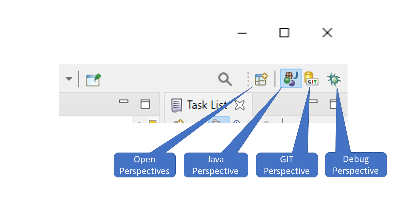 arrow_circle_upA perspective in Eclipse is a specific configuration of a set of Windows, designed to work with each other. The standard Eclipse display has a series of perspective icons at the upper right corner of the display.
