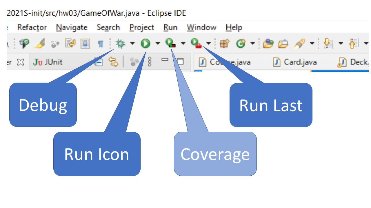 Eclipse has several Run icons (see the illustration to the right), as well as several menu sub-options under Run.
