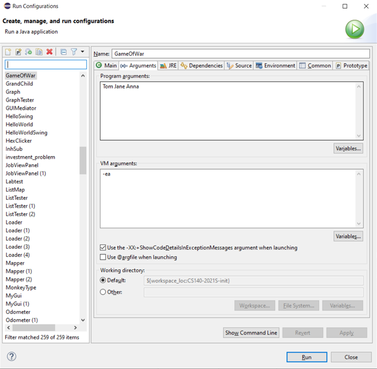 As in command line arguments, the resulting run configuration will be remembered and used again when you hit the Run button the next time.