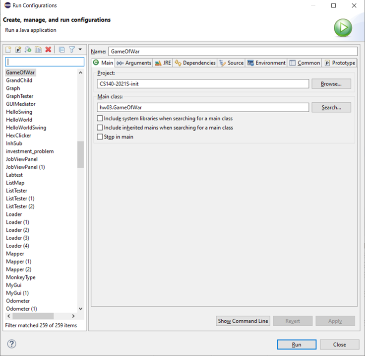 When you click on one of the Run buttons (see Run Buttons) in Eclipse, by default, no command line arguments are included in your invocation. You can override the default and specify command line arguments by selecting Run/Run configurations... from the menu, or by clicking on the pulldown arrow to the right of the run button and selecting Run configurations.... This will bring up the Eclipse Run COnfigurations dialog, with the Main tab selected as in the image to the right.